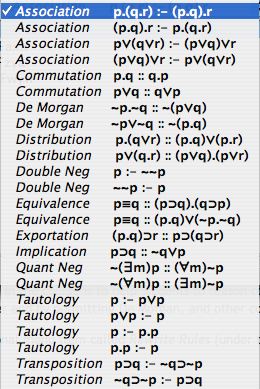 The way these are used is that a line in a proof is selected, say one with D⊃ ∼(C.I) on it, and Rewrite Rules are selected from the menu. Then a particular rewrite rules is selected (eg De Morgan) and a subformula. The program will then display what the rewrite looks like. And, if it is acceptable, it can be added to the proof. The interface looks like this: