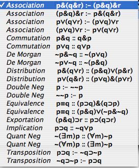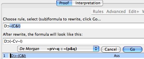 The way these are used is that a line in a proof is selected, say one with D⊃ ∼(C&I) on it, and Rewrite Rules are selected from the menu. Then a particular rewrite rules is selected (eg De Morgan) and a subformula. The program will then display what the rewrite looks like. And, if it is acceptable, it can be added to the proof. The interface looks like this: