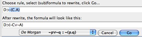 The way these are used is that a line in a proof is selected, say one with D⊃ ∼(C.I) on it, and Rewrite Rules are selected from the menu. Then a particular rewrite rules is selected (eg De Morgan) and a subformula. The program will then display what the rewrite looks like. And, if it is acceptable, it can be added to the proof. The interface looks like this: