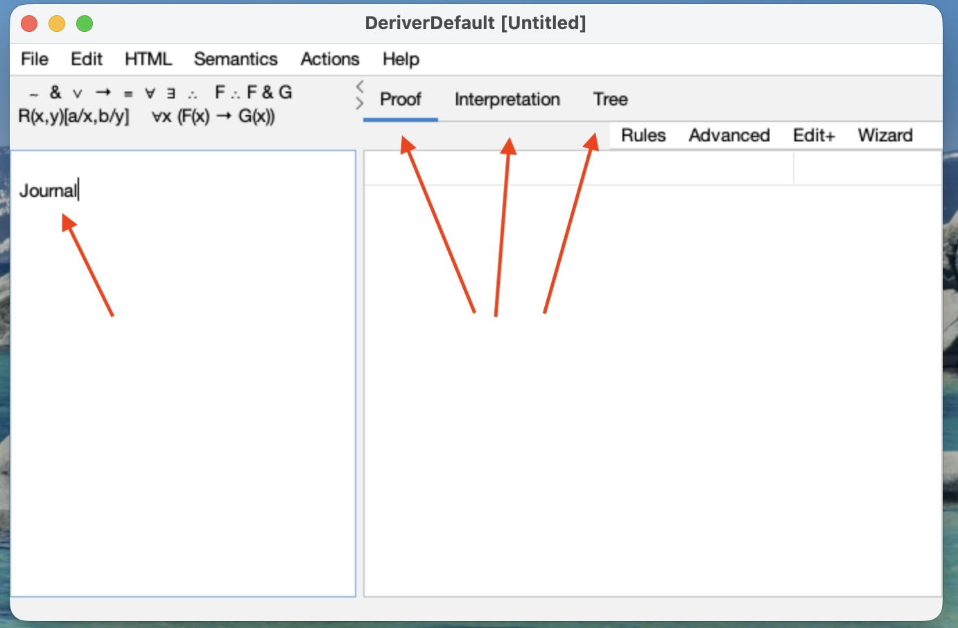 Conceptually, there are four panels: the Journal Panel, the Proof Panel, the Interpretation Panel, and the Tree Panel. Usually you will be seeing just two of these panels side by side. In the image you are seeing the Journal and the Proof.