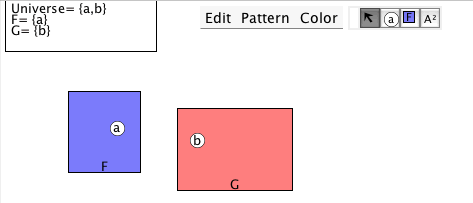 We also need to be able to interpret the idea of an object in a universe possessing or lacking a property-- within a universe containing {a,b} the object a may have the property G and the object b may lack the property G. If the entities in a universe have been depicted by little circles with labels, a way of depicting whether an object has the property G is to draw a square labelled G around those objects that do.