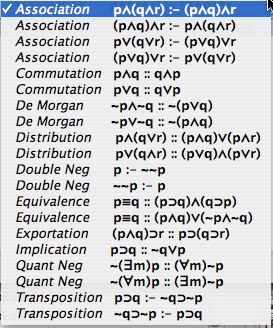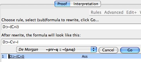 The way these are used is that a line in a proof is selected, say one with D⊃ ∼(C∧I) on it, and Rewrite Rules are selected from the menu. Then a particular rewrite rules is selected (eg De Morgan) and a subformula. The program will then display what the rewrite looks like. And, if it is acceptable, it can be added to the proof. The interface looks like this: